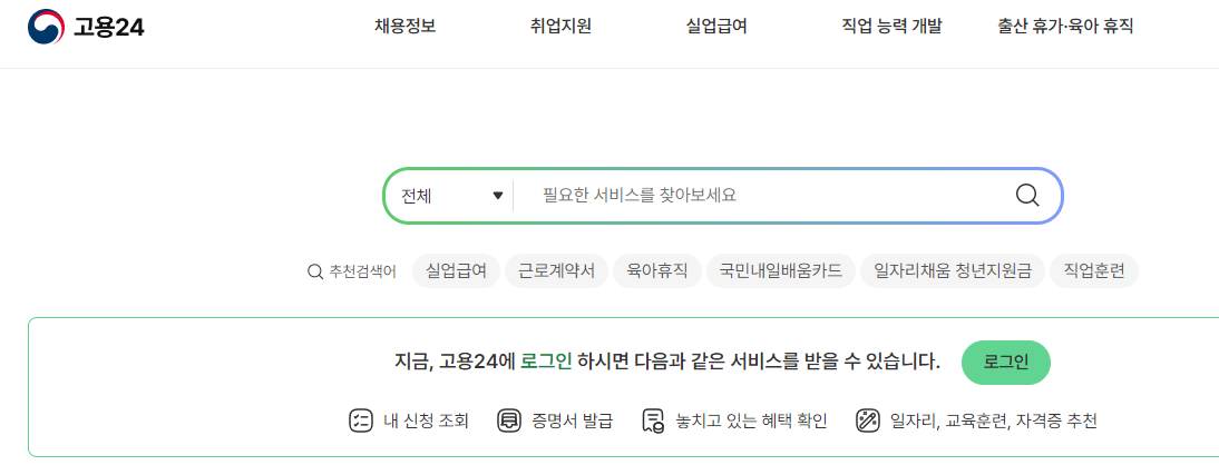 고용24는 고용노동부에서 운영하는 온라인 서비스로, 실업급여뿐만 아니라 취업 지원, 출산휴가급여, 직업훈련 등 다양한 고용 관련 서비스를 제공하는 종합 포털입니다.