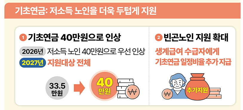 2) 기초연금 인상: 30만 원 → 40만 원 저소득 노인분들에겐 좋은 소식입니다.
