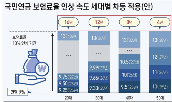보험료율 인상은 2025년부터 시작해 몇 년에 걸쳐 점진적으로 이루어질 계획이며, 소득대체율 역시 같은 시기에 조정될 것으로 보입니다.