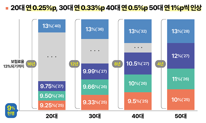 보험료율을 9%에서 13%로 올라가고 한 번에 확 오르는 게 아니라 연령대별로 다르게 올라갑니다.