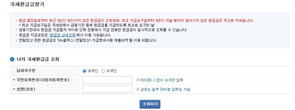 - 환급금 조회: 하위 메뉴 중 '세금 환급금 조회' 항목을 선택하면 자신의 환급금을 확인할 수 있습니다.