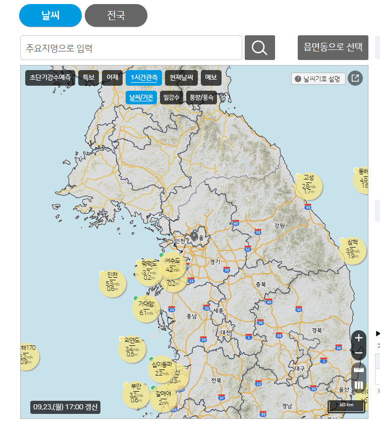 지역을 선택하면 기본적인 날씨 정보 외에도 미세먼지, 자외선 지수, 바람의 방향과 세기 등의 세부 정보를 제공받을 수 있습니다.