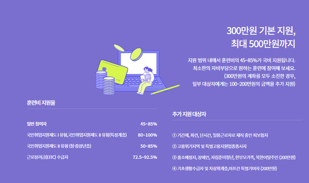 훈련비 지원: 대상자 유형에 따라 최대 300만 원에서 500만 원까지 훈련비를 지원받을 수 있습니다.