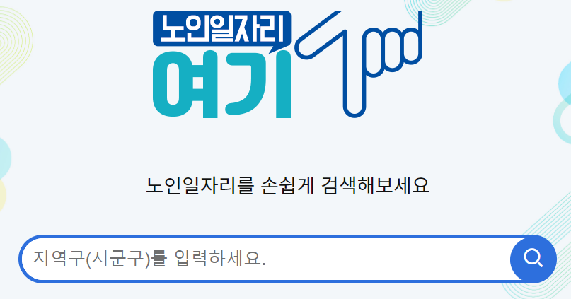 노인 일자리 여기 홈페이지의 첫 화면에는 '지역구(시군구)를 입력하세요'라는 검색 창이 뜹니다. 이 곳에 본인의 거주 지역을 입력하면 해당 지역의 노인일자리 모집 공고를 쉽게 조회할 수 있습니다.