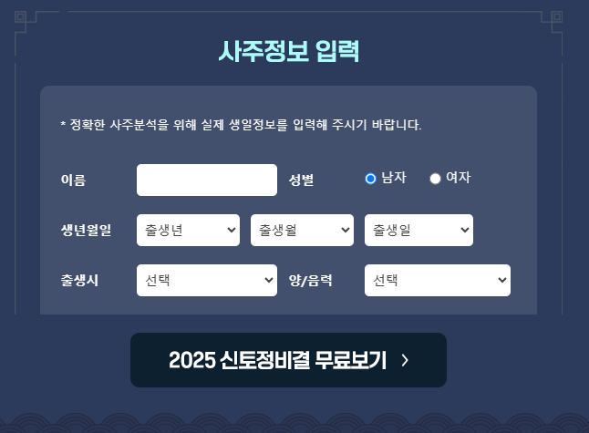 운세 결과를 정확하게 얻기 위해 생년월일, 성별, 출생 시간 등을 입력해야 합니다. 입력한 정보는 철저히 비공개로 관리되니 안심하고 입력하셔도 됩니다.