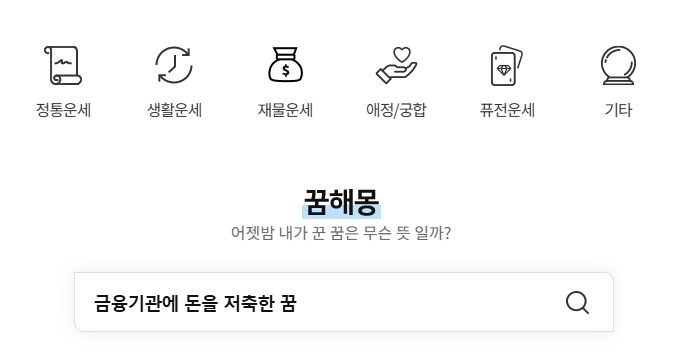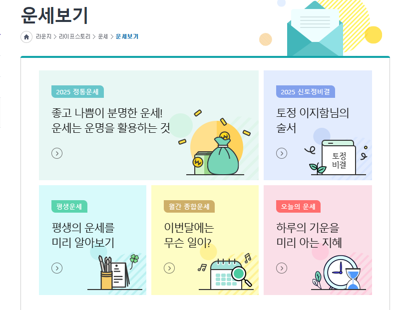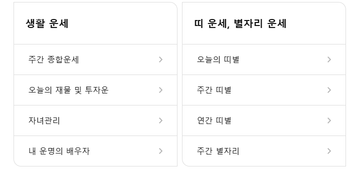 운세 서비스 페이지에 접속하면 다양한 운세 종류를 확인할 수 있습니다. 주요 서비스는 다음과 같습니다.