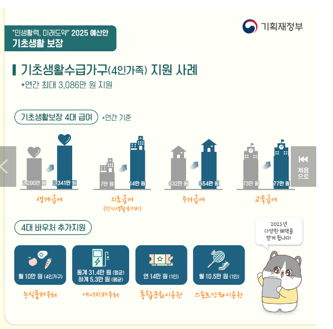 생계급여 외에도 주거급여, 의료급여, 교육급여와 같은 다양한 복지 혜택을 함께 받을 수 있어 가구의 전반적인 생활 수준을 개선하는 데 큰 도움이 됩니다.