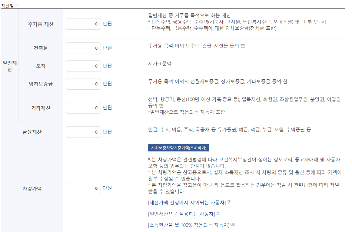 재산의 경우, 주택, 자동차, 예금 등의 자산을 포함하며, 이를 합산하여 평가합니다.