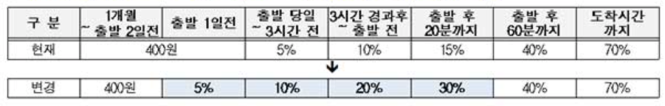 따라서 반환 위약금에 대한 수수료 정책을 변경했습니다. 출발 1일 전부터 5% 가 적용되어 당일 ~ 3시간 전, 3시간 경과 후 ~ 출발 전, 출발 후 20분까지 등의 위약금이 약 2배 정도 더 오르게 됩니다.