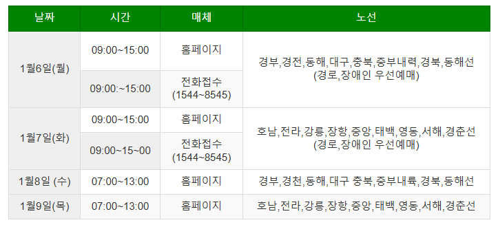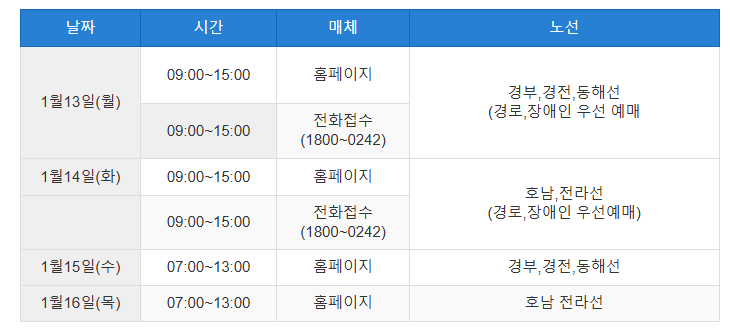 예매일정은 KTX보다 일주일 뒤에 열립니다. 1월 13일 에는 오전 9시부터 경부선·경전선·동해선 대상으로 열리게 되는데 경로, 장애인, 국가유공자 우선 예매입니다.