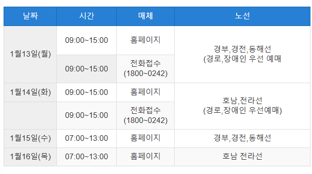 예매 첫날에는 경부선과 동해선이, 둘째 날에는 호남선과 전라선이 집중적으로 예매됩니다.