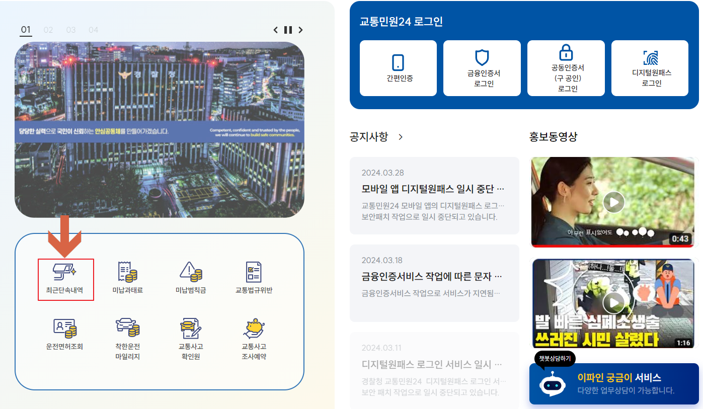 - 메뉴 선택: 본인 인증이 완료되면, '최근 단속 내역' 메뉴로 이동합니다.