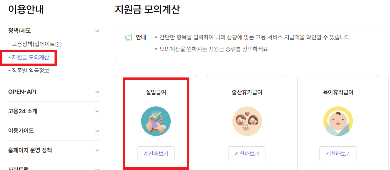 실업급여 모의계산 고용24 홈페이지 접속 - 지원금 모의계산 - 실업급여 모의계산