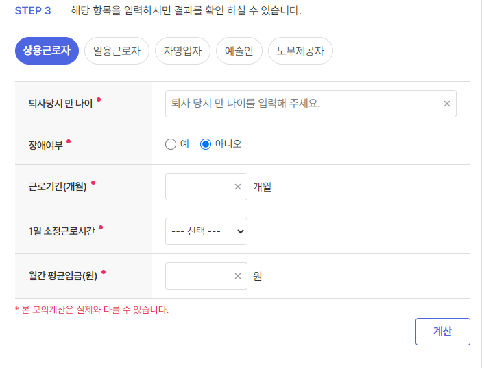 근로기간 및 임금정보 등 모의계산을 진행하기 위해 정보를 입력합니다.(일용 근로자 자영업자, 예술인, 노무제공자일 경우 아래 내용과 다를 수 있습니다.