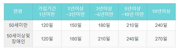 2024년 기준 실업급여 수급기간은 아래표와 같으며 퇴사시 연령을 기준으로 50세 미만과 이산인 것에 따라 수급기간에 차이가 있습니다.