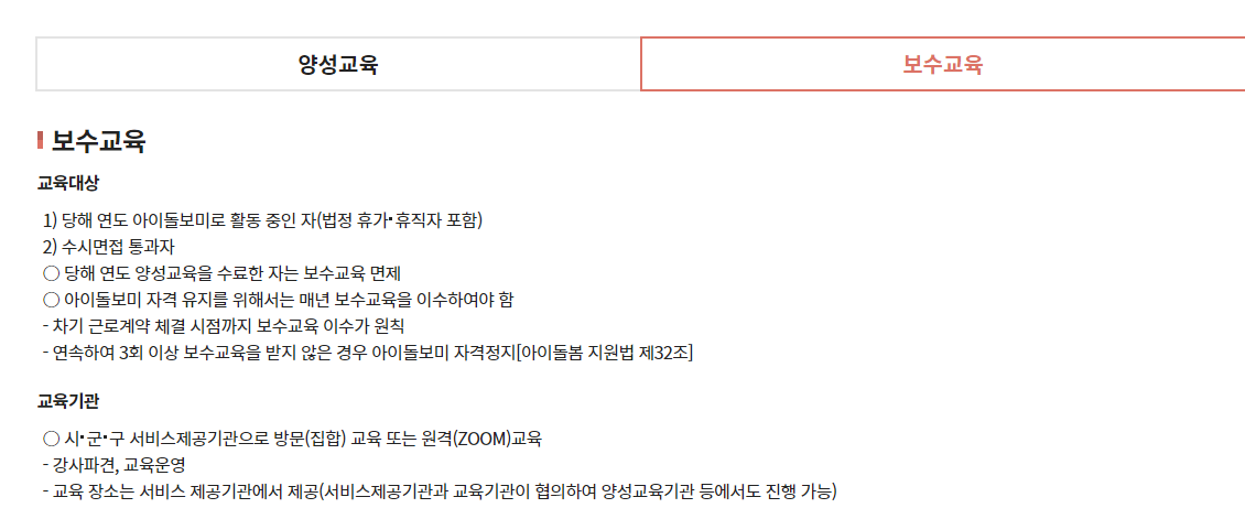 보수 교육: 수료 후 매년 보수 교육을 이수해야 합니다. 보수 교육은 기존 아이돌보미의 역량 강화를 위해 제공되며, 새로운 돌봄 기술과 최신 정보를 제공합니다.