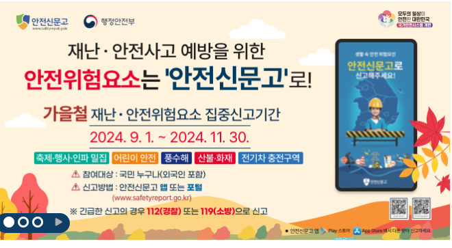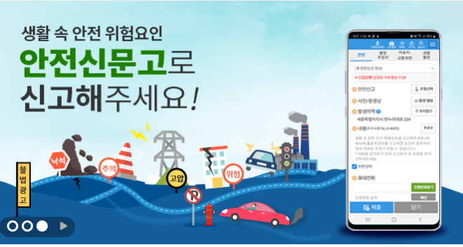 안전신문고는 국민들의 일상생활 속 위험 요소와 불편 사항을 신고하고, 안전 관련 정보를 공유할 수 있는 행정안전부의 공식 포털 사이트입니다.