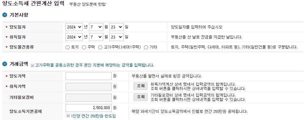 기본 정보양도일자, 취득일자, 양도 금액, 취득 금액, 보유기간 등의 기본 정보를 입력합니다.
