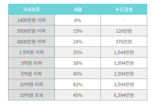 2년 이상 보유한 자산에 대해서는 과세표준 금액에 따라 6%에서 45%까지의 8단계 초과누진세율이 적용됩니다.