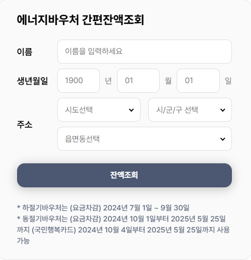 에너지 바우처 잔액을 조회하려면, 성명, 생년월일, 주소를 입력해야 합니다. 잔액 조회는 사용 기간 내에만 가능하며, 동절기 바우처는 국민행복카드를 통해 차감됩니다.