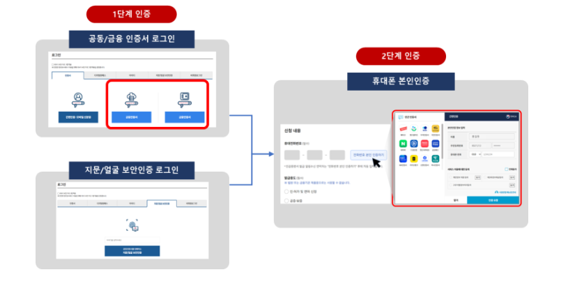 로그인 시 공인인증서, 공동 인증서, 또는 간편 인증(네이버, 카카오톡 등)을 사용할 수 있습니다.