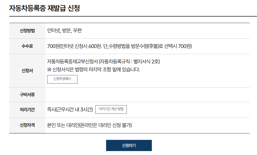 ✅ 3단계: 신청하기 검색 결과에서 "자동차등록증 재발급 신청" 항목을 선택한 후, 신청 버튼을 클릭합니다.