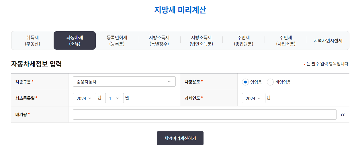 자동차세는 배기량과 용도에 따라 다르게 계산됩니다. 위택스를 이용하여 정확하게 계산해 볼 수 있습니다.