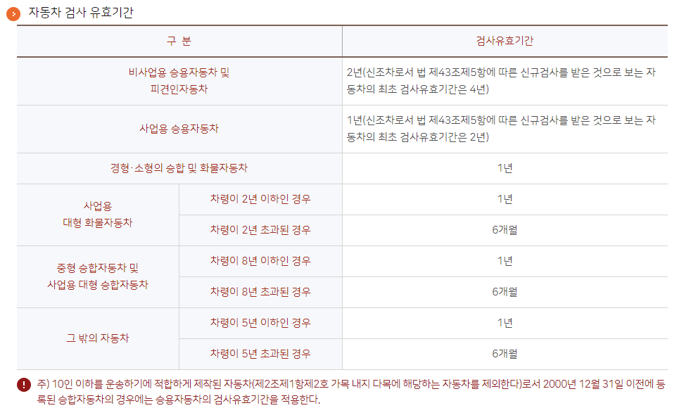 자동차 검사주기는 연평균주행거리,용도,교통사고피해규모 등을 종합적으로 감안하여 적용됩니다.