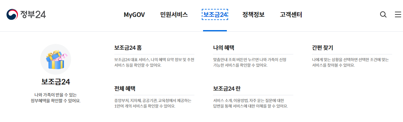 보조금 24는 중앙부처, 지자체, 공공기관에서 제공하는 다양한 혜택을 안내하고 맞춤형으로 제공받을 수 있는 서비스입니다. 약 1만 여개의 서비스를 안내하고 있으며, 나와 가족이 받을 수 있는 혜택을 맞춤형으로 확인하고 신청할 수 있습니다.