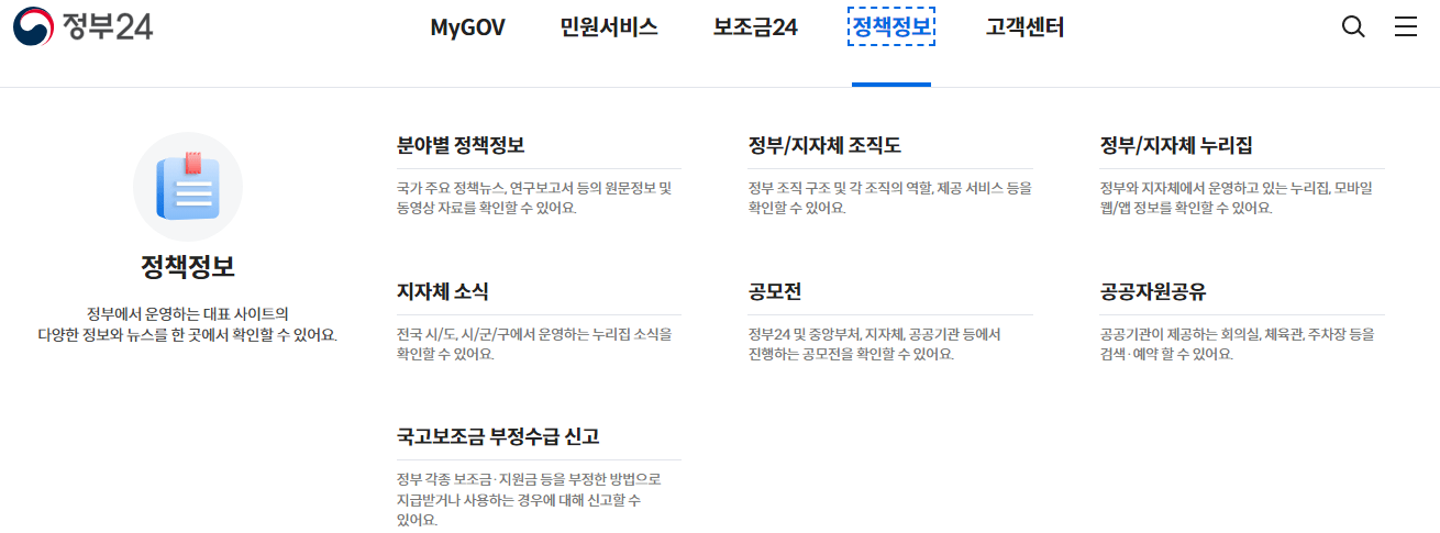 분야별 정책정보: 다양한 분야에 걸친 정부의 정책정보를 제공합니다. 정책의 내용과 방향을 쉽게 파악할 수 있습니다.