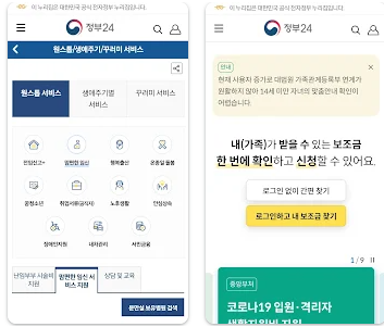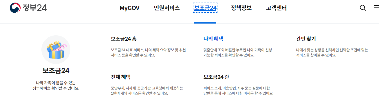 나(가족)의 혜택: 맞춤안내 조회 버튼 하나만 누르면 나와 가족이 신청 가능한 혜택과 서비스를 한눈에 확인할 수 있습니다. 간편 찾기:간단한 질문에 답하면 로그인 없이도 받을 수 있는 혜택을 간편하게 확인할 수 있습니다.
