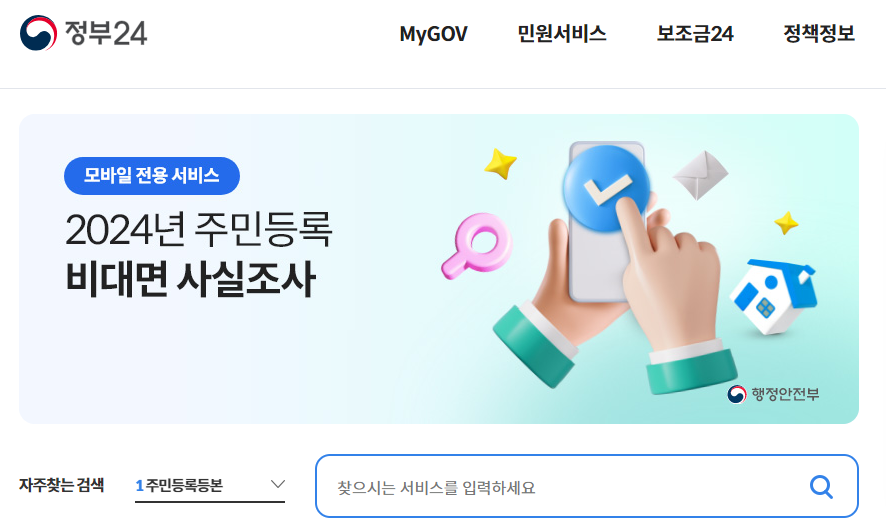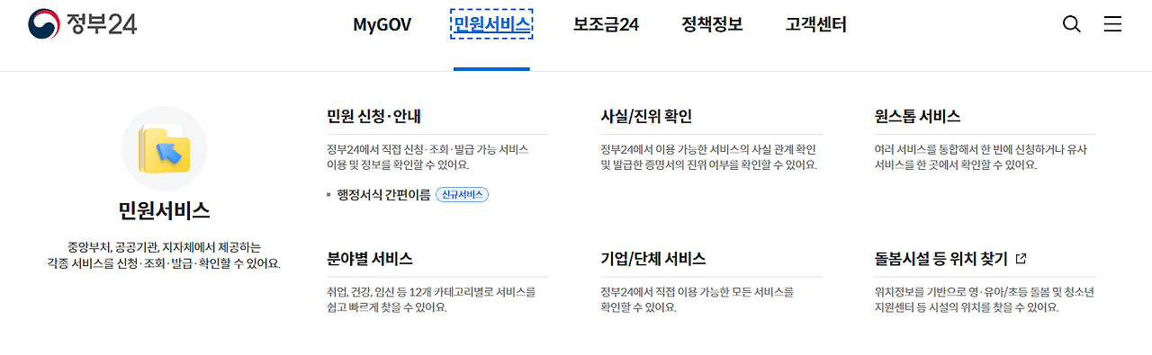 정부 24는 대한민국 국민이 정부 민원 서비스, 혜택 등을 한 곳에서 쉽게 접근하고 이용할 수 있도록 하는 대표 포털입니다. 여권 재발급, 증명서 발급, 보조금 신청 등 다양한 서비스를 빠르고