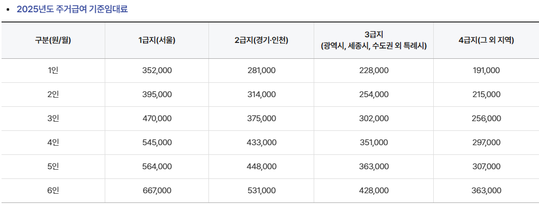 임차급여(월세 지원금)는 거주 지역과 가구원 수에 따라 금액이 다릅니다. 정부는 전국을 1~4 급지로 나누어 해당 지역의 주거비 수준에 맞춰 지원금을 책정하고 있습니다.