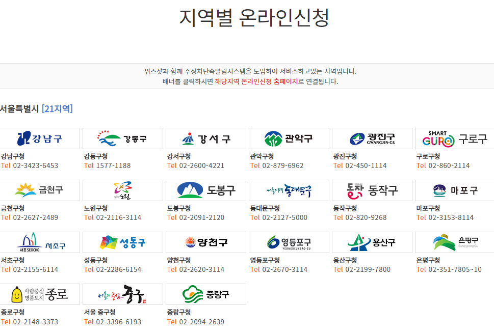 지역 선택 및 접속 주정차 단속 알림 시스템을 도입한 지역 목록이 나타납니다. 목록에서 자신이 원하는 지역을 선택한 후, 선택한 지역의 주정차 단속 알림 시스템 페이지로 이동합니다.
