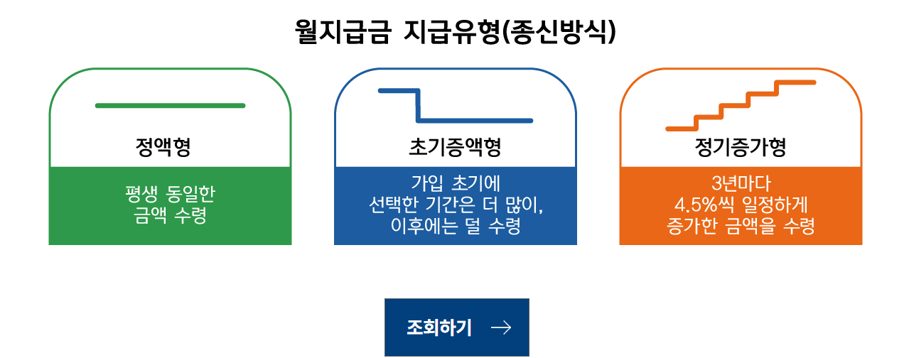 종신으로 매달지급받는 주택연금 수령방법에도 세가지가 있는데 평생동일한 금액으로 받는 정액형, 가입초기에 선택한 기간 동안에는 많이 그 이후에는 적게 받는 초기 증액형, 3년마다 4.5%씩 일정하게 증가한 금액을 받게 되는 정기증가형 중 한 가지를 선택할 수 있습니다.