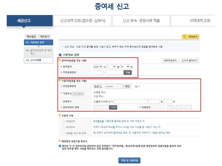 공인인증서 등을 이용해 로그인하고, 홈택스의 '일반증여 신고' 항목을 선택합니다 증여일자, 증여자와 수증자의 주민등록번호, 주소, 관계, 전화번호 등을 입력합니다.