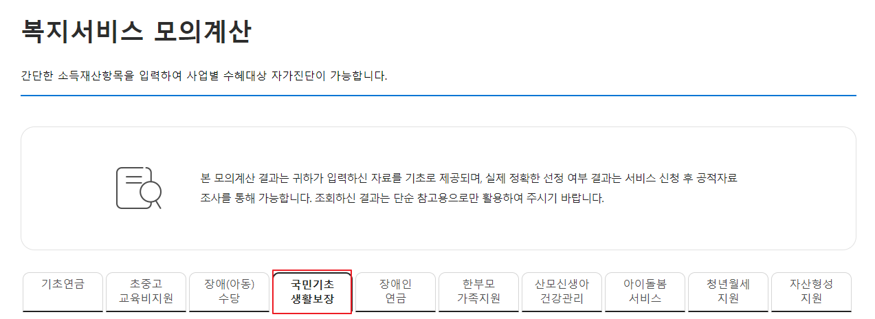 복지서비스 - 모의 계산 - 국민기초생활보장 순서로 진행하시면 됩니다.