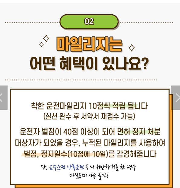 위에 말씀드린 것처럼 서약하고 1년 동안 안전 운전하면 10점씩 적립이 되고요. 운전면허 정지 처분을 받게 되면 누적 마일리지만큼 벌점 / 정지 일수가 감면됩니다.