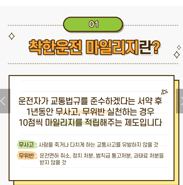 착한 운전 마일리지란 교통법규를 준수하고 무사고를 유지하는 운전자에게 매년 10점의 마일리지를 제공하여, 벌점 감경에 활용할 수 있는 혜택을 줍니다.