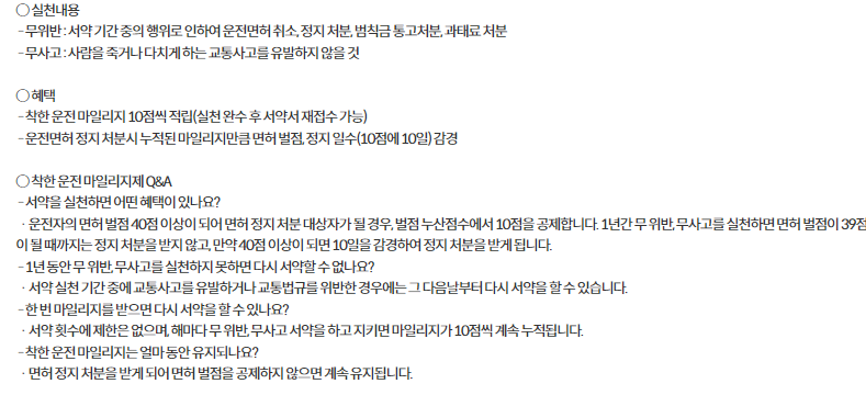 또한, 착한운전 마일리지를 통해 벌점을 감면받는 방식이기 때문에 별도의 벌점 감경 교육을 받지 않아도 됩니다.
