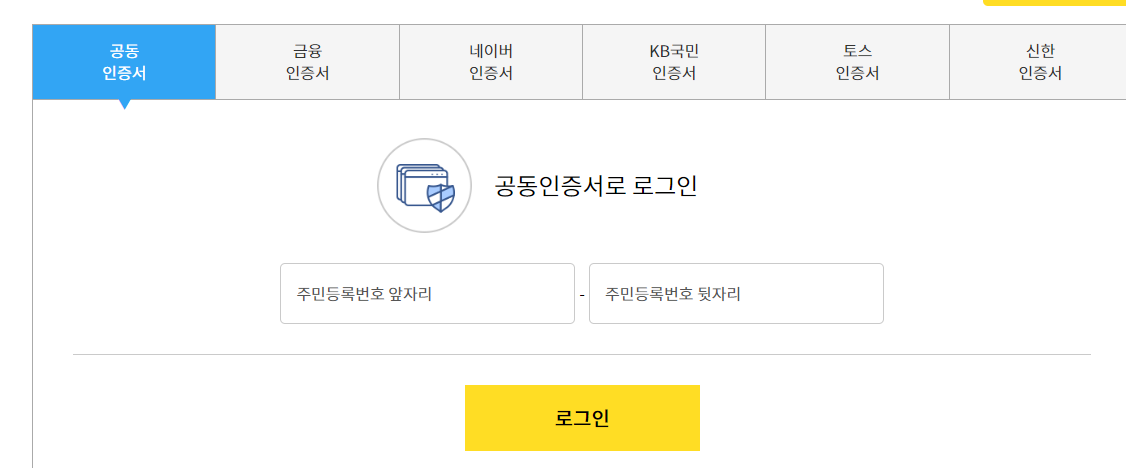 로그인: 공동인증서 또는 금융인증서를 사용해 로그인합니다.