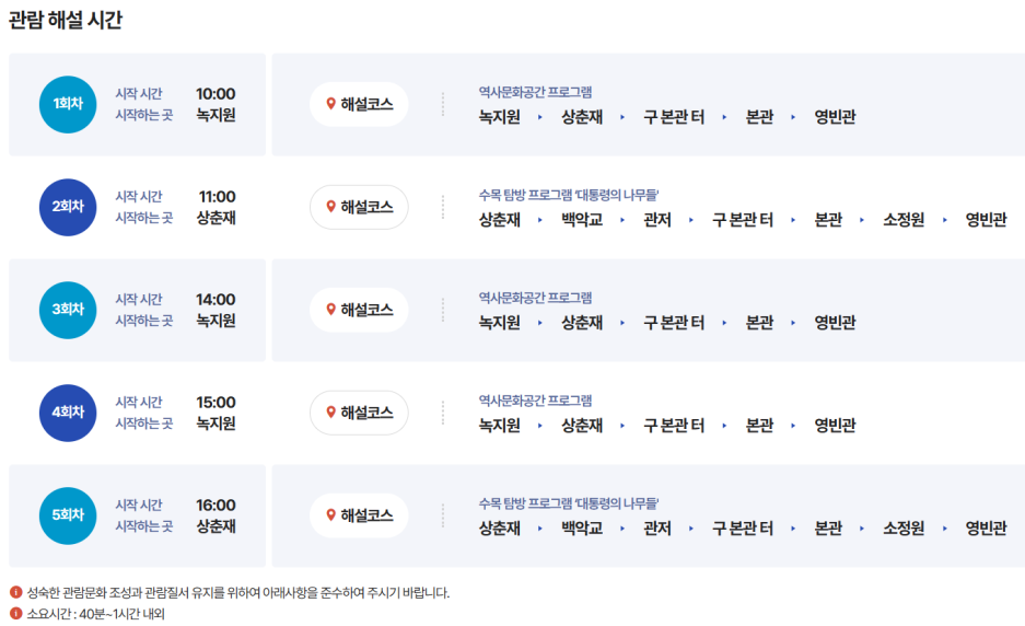 대한민국 대통령의 관저는 규모도 큰 데다 익숙한 여행지가 아니다 보니 놓치고 오는 부분이 생길 수밖에 없는 거 같아요. 공식홈페이지에서 추천하는 코스를 여행해 보는 것도 좋은 방법 중 하나입니다.