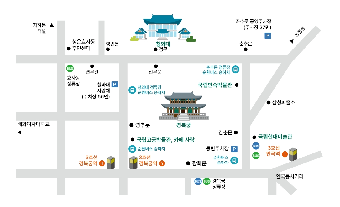 주차장 : 청와대 사랑채주차장, 춘추문 공영주차장, 경복궁 동편주차장(순환버스이용)