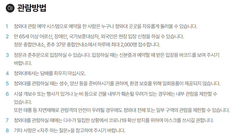 청와대 현장 예약은 만 65세 이상 어르신, 징애인, 국가보훈대상자, 외국인. 인원 1일 2,000명 신분증등 증빙서류 반드시 필요합니다.
