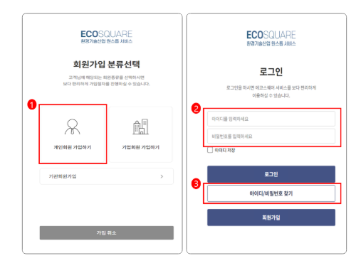 1. 에코스퀘어 접속: 에코스퀘어(www.ecosq.or.kr) 사이트에 접속합니다.