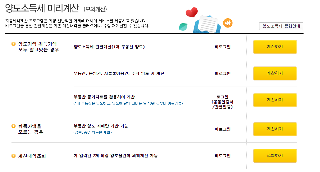 국세청 홈택스에서는 양도소득세를 쉽게 계산할 수 있는 자동계산기를 제공하고 있습니다. 이를 통해 정확한 양도소득세를 계산할 수 있으며, 비과세 및 중과세 자가진단도 가능합니다.