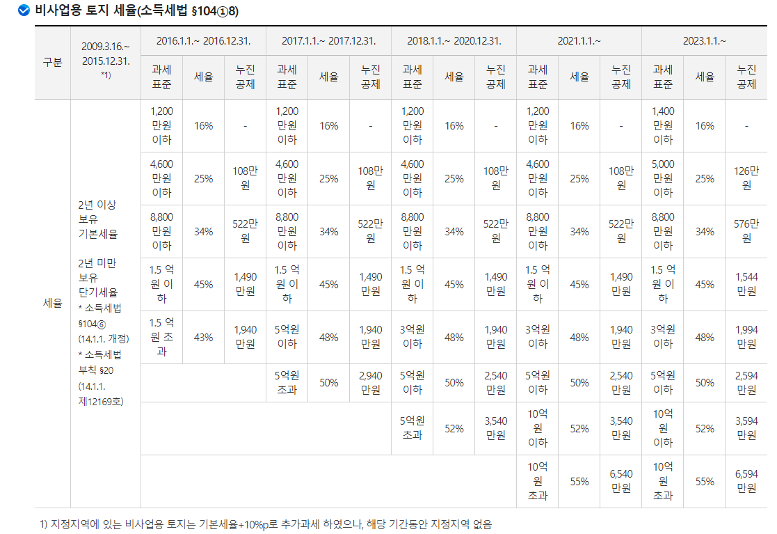 비사업용 토지는 일반 사업용 토지에 비해 세율이 높습니다. 비사업용 토지의 경우 기본세율에 10%가 추가로 부과됩니다.