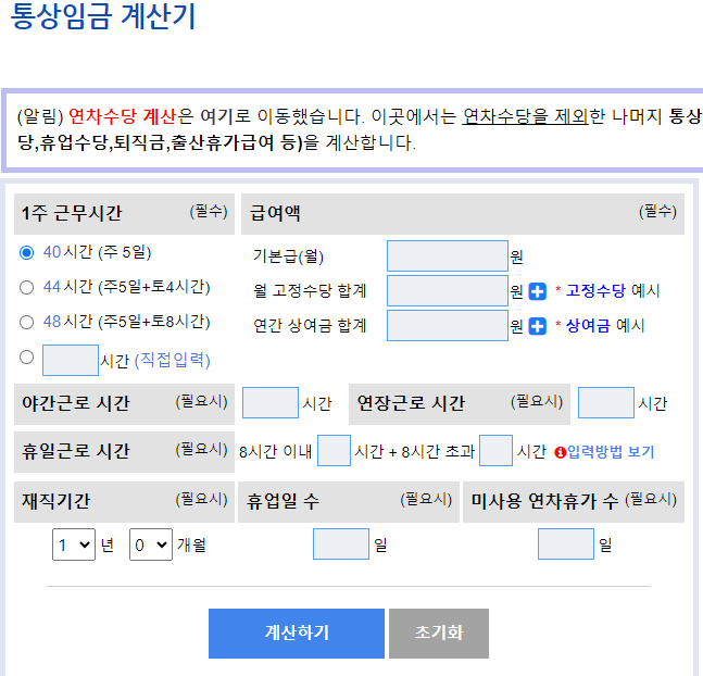 위의 계산방법으로 직접계산하실 수도 있고 노동 OK 사이트를 통해서도 간단하게 통상임금을 계산하실로 있습니다.