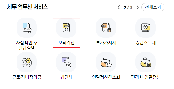 메인화면 보시면 오른쪽 하단에 세금모의계산이 있어요. 여기에 다양한 계산기가 모여있는데요. 대부분 세금관련된 서비스이기 때문에 알아두시면 여러모로 유용하게 쓸 수 있어요.