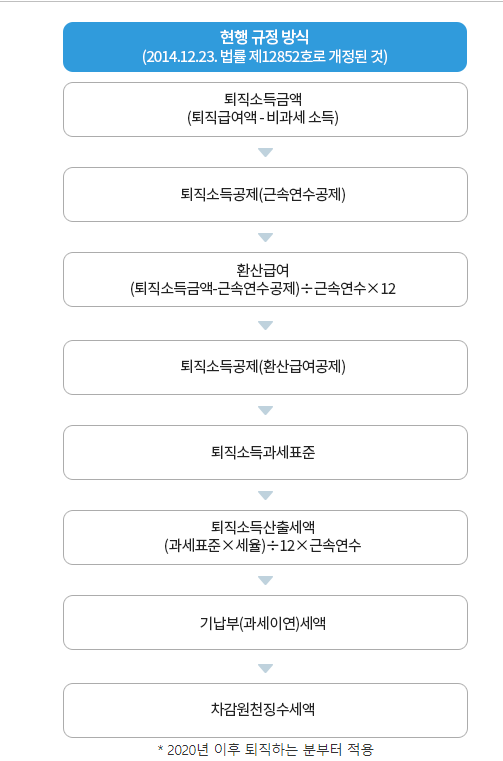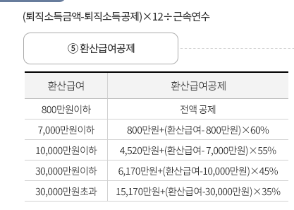 환산급여 계산 퇴직소득 금액에서 근속연수 공제액을 빼고 12를 곱한 다음 근속연수로 나눕니다.